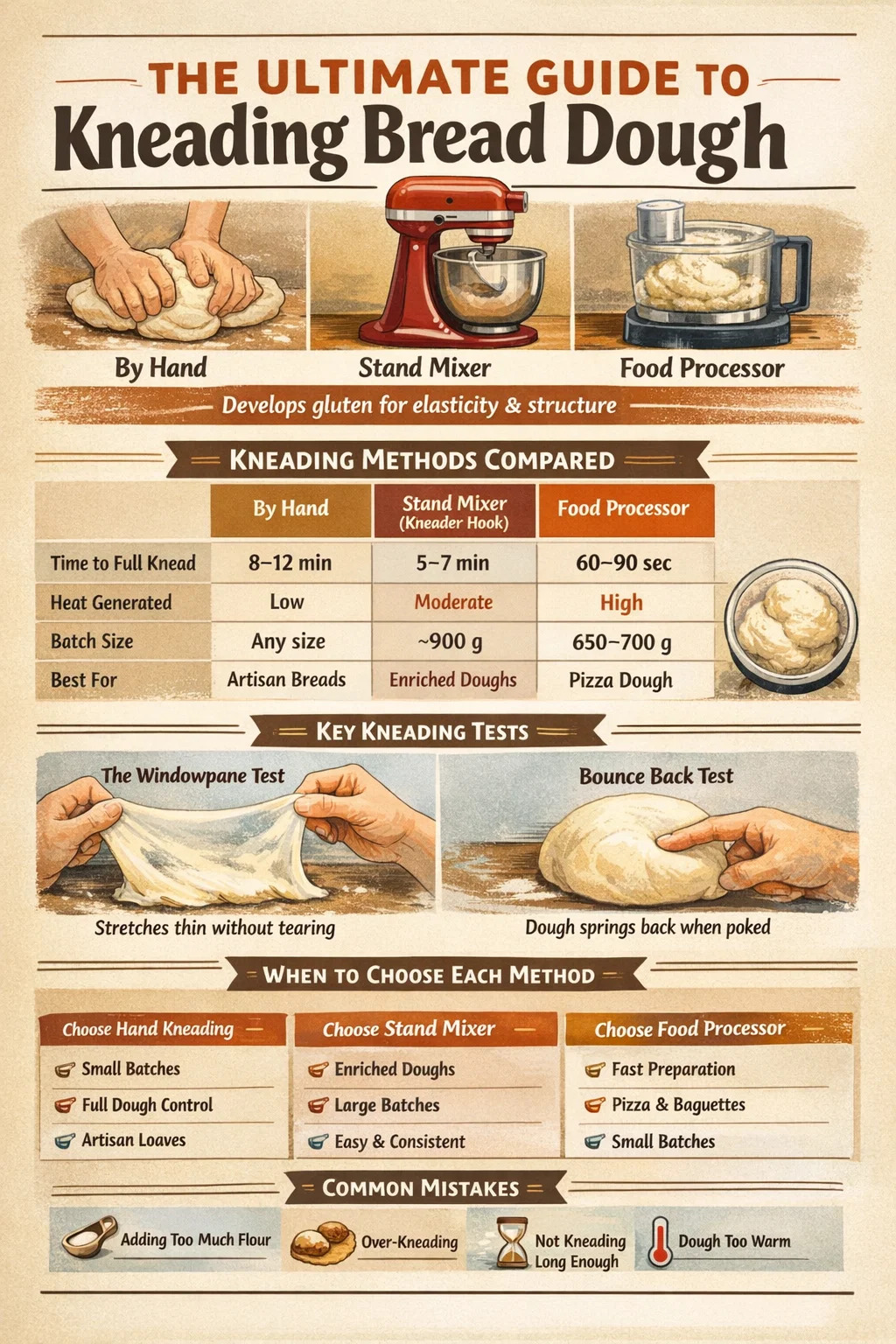 بالنسبة لمعظم عجائن الخبز، فإن خطاف العجن ذو الحامل الذي يعمل على السرعة 2 سينتج الغلوتين الكامل خلال 5-7 دقائق. قد تحتاج بعض أنواع العجين الأكثر كثافة، مثل عجينة الخبز أو عجينة البسكويت المملح بنسبة 56-60% من الماء، إلى 8 دقائق. يعد الإفراط في العجن خطرًا حقيقيًا عند السرعات العالية: تشغيل الخلاط على السرعة 4 أو أعلى لفترة طويلة جدًا يمكن أن يؤدي إلى تسخين العجين من خلال الاحتكاك، وإضعاف شبكة الغلوتين، وإنتاج نسيج لزج للغاية ومتحلل.