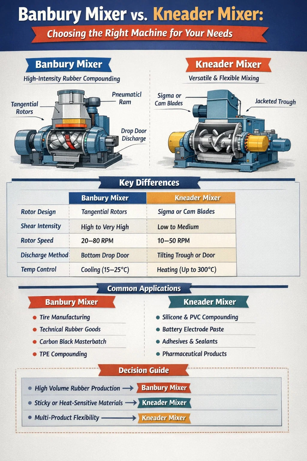 In practice, many manufacturing facilities use both types — a Banbury for high-volume rubber base compound production and one or more kneaders for specialty products, prototyping, or materials that cannot be processed in the Banbury. Treating the two machine types as complementary rather than competing is often the most pragmatic approach when product diversity is a factor in your operations.