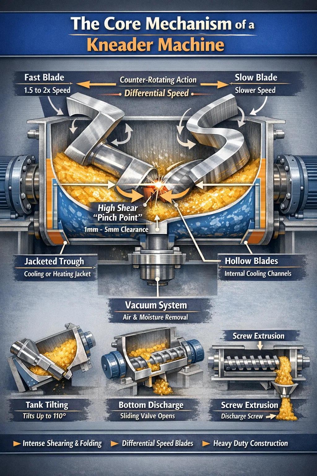 أ آلة العجن يعمل من خلال استخدام زوج من الشفرات ذات الدوران المعاكس (عادةً شفرات على شكل حرف Z أو شفرات سيجما) تعمل بسرعات مختلفة داخل حوض على شكل W. الهدف الأساسي هو إخضاع المواد عالية اللزوجة أو شبه الصلبة القص المكثف، والطي، والضغط . على عكس الخلاطات القياسية التي تقوم فقط بنقل المواد، يقوم العجن بدفع المادة من خلال الخلوصات الضيقة بين الشفرات وجدران الحوض، مما يضمن مزيجًا متجانسًا من المكونات التي تكون مقاومة للتدفق.