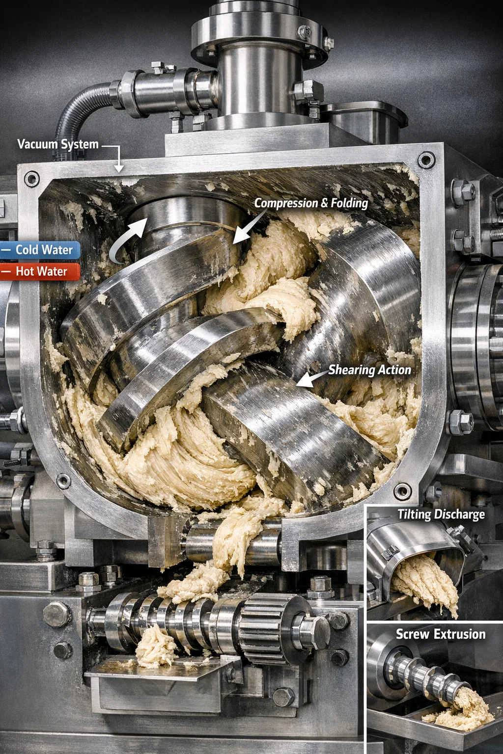 أ العجن يعمل على نفس مبدأ عجن العجين في المنزل، ولكنه يستخدم قوة ميكانيكية هائلة وهياكل معدنية متطورة. إنها ليست مجرد "تحريك" بسيط، ولكنها تعالج مواد شديدة اللزوجة لا تستطيع الملاعق العادية التعامل معها من خلال "العجن والضغط والسحب والتمزيق" المتكرر.