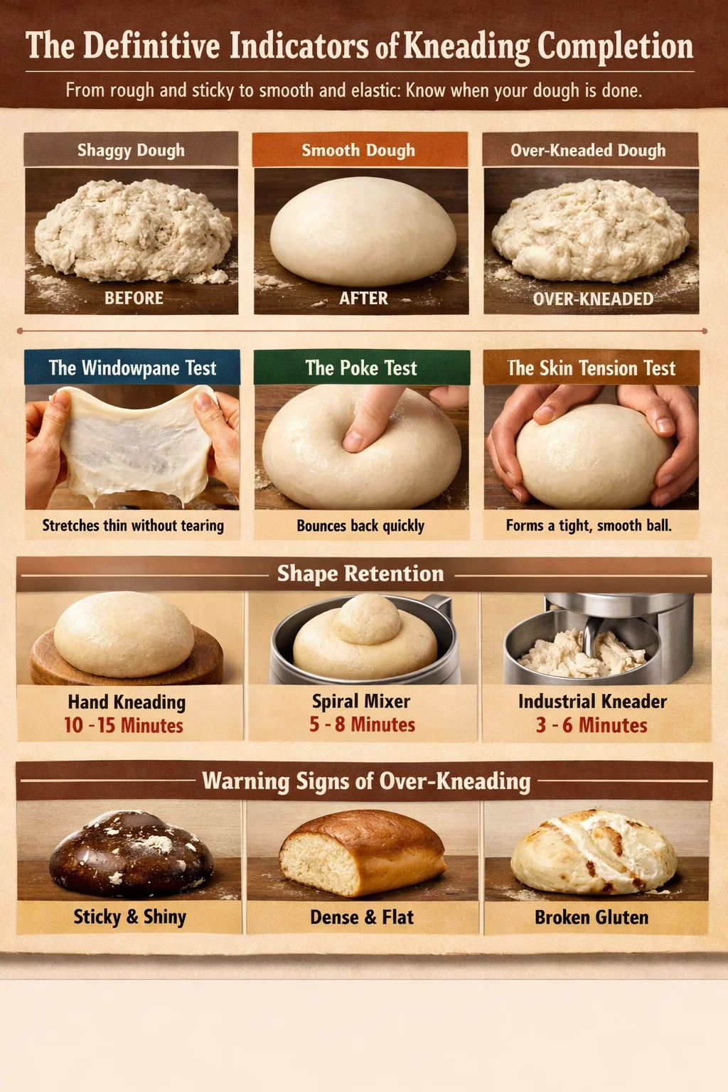 بدلاً من الاعتماد فقط على المؤقت، الذي يمكن أن يكون غير دقيق بسبب الرطوبة أو محتوى بروتين الدقيق، استخدم هذه المعايير المادية للتحقق من حالة جهازك. يعجن مادة.