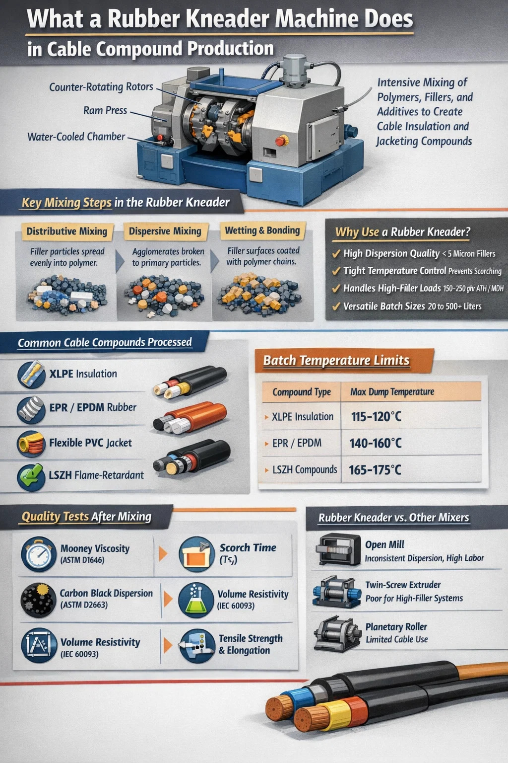 آلة العجن المطاطية - والتي تسمى أيضًا الخلاط الداخلي أو عجن التشتت - هي معدات الخلط الأساسية المستخدمة لتحويل المطاط الخام أو المواد الأساسية البوليمرية إلى مركبات كابلات جاهزة جاهزة للبثق. في تصنيع الكابلات، يجب أن يلبي المجمع المتطلبات الكهربائية والميكانيكية والحرارية الصارمة. يحقق العجن المطاطي ذلك من خلال تطبيق إجهاد القص والضغط والحرارة المكثف لمزج اللدائن والحشوات والملدنات ومضادات الأكسدة ومثبطات اللهب وعوامل الفلكنة في كتلة موحدة وقابلة للمعالجة.