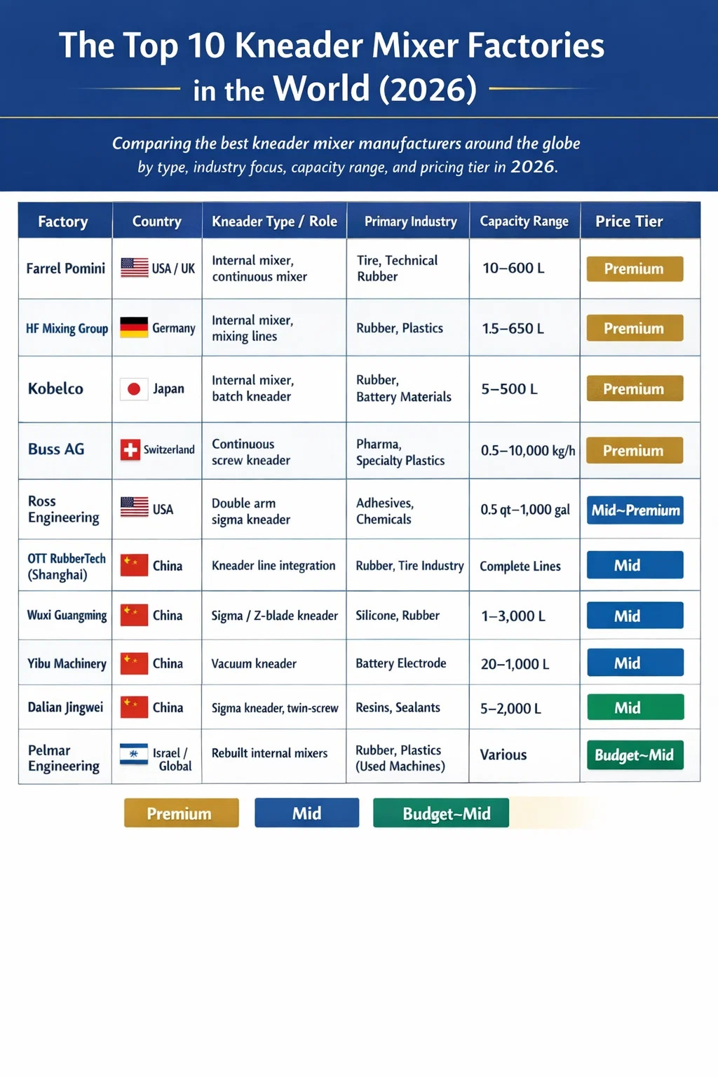 إذا كنت مصادر أ العجن خلاط للمطاط أو السيليكون أو المواد اللاصقة أو مواد البطارية أو أي مركب عالي اللزوجة، فإن الشركة المصنعة التي تختارها ستحدد بشكل مباشر عمر المعدات وجودة الخلط والتكلفة الإجمالية للملكية. بعد تقييم حجم الإنتاج، والشهادات الفنية، وقاعدة التثبيت العالمية، وتعليقات العملاء عبر العشرات من الموردين، المصانع العشرة التي تقود العالم باستمرار في تصنيع وتوريد خلاطات العجن في عام 2026 هي: فاريل بوميني (الولايات المتحدة الأمريكية/المملكة المتحدة)، مجموعة مجموعة خلط التردد العالي (ألمانيا)، كوبيلكو (اليابان)، بوس ايه جي (سويسرا)، هندسة روس (الولايات المتحدة الأمريكية)، OTT RuberTech International Trading (Shanghai) Co., Ltd. (الصين)، وشى قوانغمينغ Machinery (الصين)، ماكينات ييبو (الصين)، داليان جينجوي Chemical Machinery (الصين)، و شركة بيلمار الهندسية (إسرائيل). كل منها يجلب قوة مميزة - سواء كان ذلك يتعلق بقدرة عزم الدوران العالية جدًا، أو التصميم الصحي من الدرجة الصيدلانية، أو التكامل الكامل لخط العجن المطاطي، أو الأسعار التنافسية من حيث التكلفة للإنتاج متوسط الحجم.
