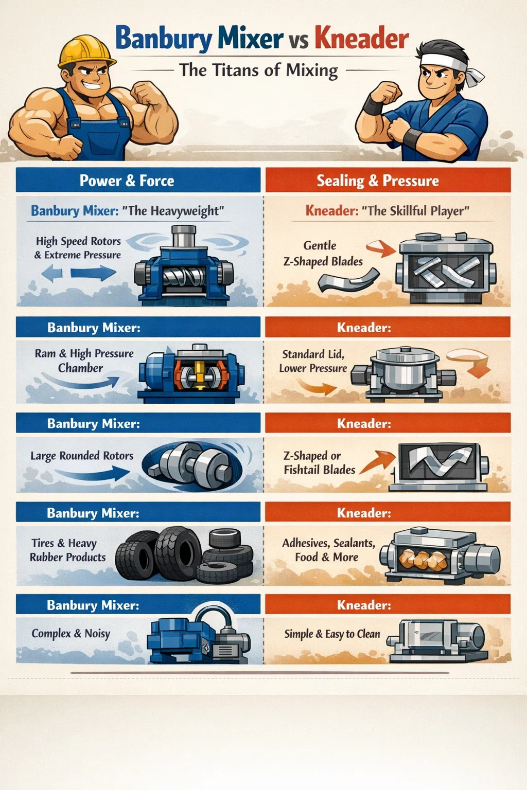 في عالم معالجة المطاط والبلاستيك، **تشبه خلاطات وعجنات بانبري** رجلين قويين لهما شخصيات مختلفة. في حين أن كلاهما يمكنهما خلط المواد الخام اللزجة بشكل موحد، إلا أنهما يختلفان بشكل كبير في أساليب العمل والقوة.